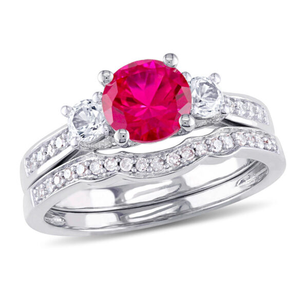Simply stunning, this glistening bridal set is a beautiful beginning to the rest of your lives together. Shimmering in cool 10K white gold, the engagement ring features a dazzling 6.0mm bright red ruby flanked by a pair of smaller created white sapphires. Sparkling pav??-set diamonds adorn each side of the tapered shank for a look she can’t help but admire. On your special day, a coordinating contoured diamond-lined wedding band completes this significant expression of your love. Radiant with 1/8 ct. t.w. of diamonds and a brilliant buffed luster, this bridal set is everything she imagined and more.